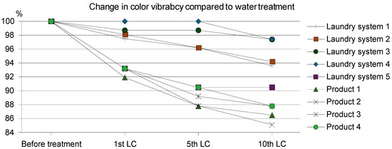The change in the color brightness of blue-colored cotton fabric after using different laundry systems. LC—laundry cycle.
