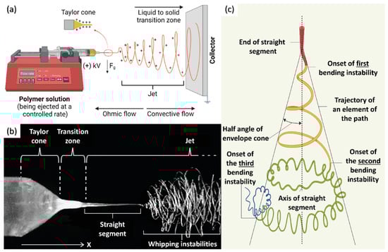 Figure (a) Electrospinning setup, (b) Taylor cone, (c) position of the jet path adapted from [37].