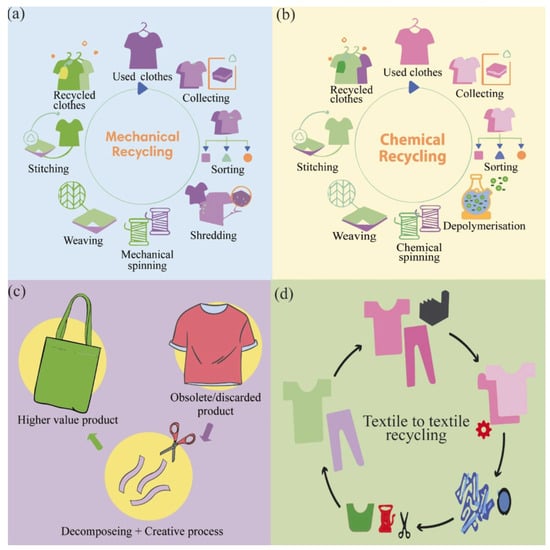 Schematic diagram illustrating common techniques for recycling post-consumer garments: (a) mechanical recycling; (b) chemical recycling; (c) upcycling; and (d) textile-to-textile recycling. Figure reproduced from [65].