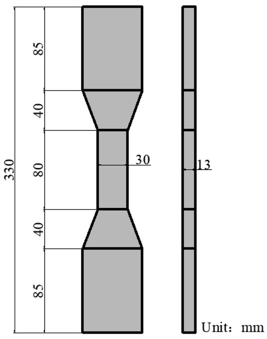 According to CECS 13: 2009 [26], in addition to the glass fiber textile-reinforced specimens, six experimental groups of compressive specimens were prepared. Each experimental group prepared three 100 mm × 100 mm × 100 mm cubes for compressive experiments. For tensile testing, dog-bone specimens (Figure 2) were exclusively prepared for five distinct fiber-reinforced ECC groups, with six replicates per group. The drop weight impact tests involved preparing 500 mm × 500 mm × 50 mm bidirectional panels across eight experimental groups, each comprising three specimens. The casting process is illustrated using a steel fiber-reinforced Engineered Cementitious Composite (ECC) with three layers of glass fiber textile as an example. Following the complete mixing of the cementitious matrix, steel fibers, and other materials, the procedure involved, sequentially, (1) pouring a 3 mm thick layer of the ECC, (2) overlaying it with one layer of glass fiber textile, (3) pouring another 3 mm cementitious layer, (4) placing the second glass fiber textile layer, (5) casting a third 3 mm cementitious layer, and (6) applying the final glass fiber textile layer, with the remaining height of the formwork then cast with the ECC, ultimately completing the specimen casting. All specimens were placed in a standard curing room and removed from the molds after approximately 24 h and then cured in the curing room for 28 days before conducting compression, tensile, and drop weight impact tests.