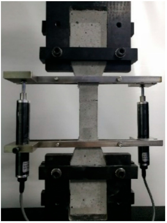 Tensile tests were conducted following JCT 2461-2018 [27], using an MTS electro-hydraulic servo-controlled testing machine, with the testing apparatus illustrated in Figure 3. The tests were carried out under quasi-static loading conditions with a displacement control rate of 0.5 mm/min. The stress–strain data were calculated based on the obtained measurements.