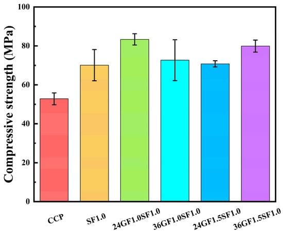 Figure 5 demonstrates the influence of various fiber combinations on the 28-day compressive strength of specimens, revealing that both individual steel fiber (SF) incorporation and its hybridization with glass fibers (GFs) effectively enhance compressive strength, with particularly notable improvement observed when adding glass fibers to specimens containing 1.0 vol% steel fibers due to their synergistic effect in constraining lateral expansion and thereby boosting compressive resistance. The 24GF1.0SF1.0 specimen exhibited the highest compressive strength among all tested specimens. The higher compressive strength of 24GF1.0SF1.0 compared to 36GF1.0SF1.0 stems from its greater number of shorter 24 mm glass fibers per unit area, providing superior crack-blocking capability; at a fiber content of 1.0 vol% by volume, 24 mm glass fibers demonstrate superior dispersibility compared to 36 mm glass fibers.