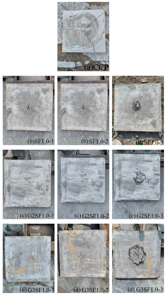The failure mode of the unreinforced specimens, as shown in Figure 6a, indicates that cracks on the bottom surface developed radially. These cracks extended to the edges of the panel, ultimately resulting in the panel breaking into several pieces, characterizing the brittle failure.