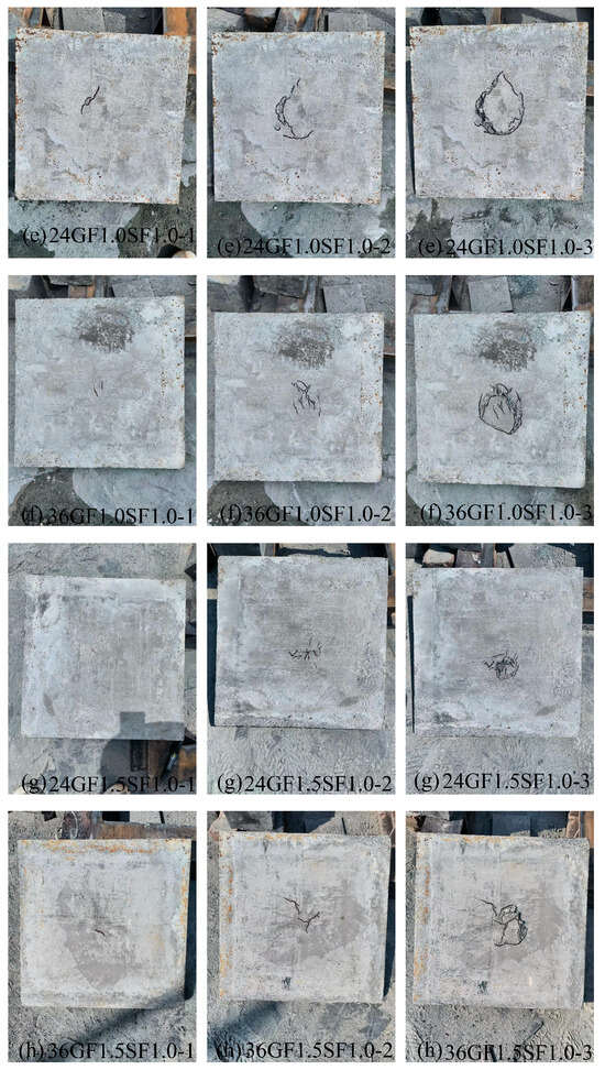 Figure 6b–h illustrates the crack development process of fiber-reinforced specimens under impact loading. Unlike the failure mode of unreinforced specimens, the failure modes of the fiber reinforced specimens exhibited localized punching shear failure at the impact site. The crack development can be roughly divided into three stages: