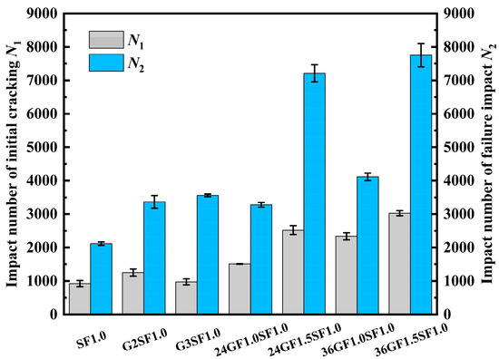 Figure 7 and Table 6 show the effect of glass fiber length on the impact resistance of the specimen. With increasing lengths of glass fibers, both the initial cracking impact number and the failure impact number correspondingly increased, the maximum values for the initial cracking impact number and the failure impact number were achieved with the 36GF1.5SF1.0 specimens, which improved by 20% and 8%, compared to the 24GF1.5SF1.0 specimens, respectively. This can be attributed to the longer glass fibers being better at bridging macro-cracks, thereby increasing the impact resistance of the specimens.