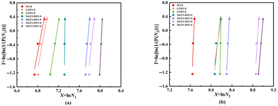 From Table 7, it can be observed that the linear fit R2 for the impact numbers of fiber-reinforced specimens ranges from 0.8239 up to 0.9999. All samples have R2 values exceeding 0.8, indicating that the mathematical model possesses sufficient reliability [31]. The reliability model proposed by Rahmani et al. [32] indicates a strong linear relationship between and As shown in Figure 8, the experimental data points for the impact numbers of various specimen groups are distributed on a straight line, demonstrating that the two-parameter Weibull distribution accurately characterizes the impact numbers of fiber-reinforced specimens.