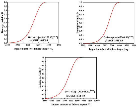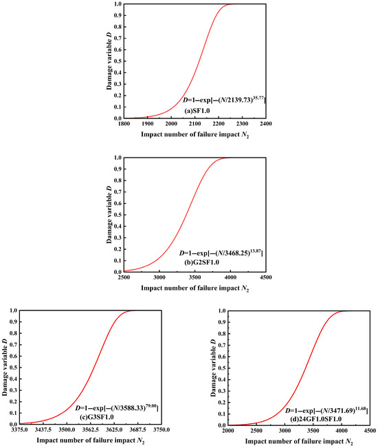 Using Equations (9), (11), and (13), combined with Table 7, the damage evolution equation of specimen failure impact life was established and the damage evolution diagrams for each group of specimens were plotted, as shown in Figure 9.