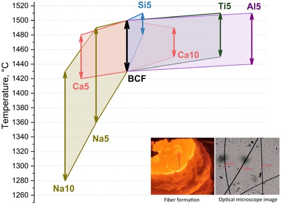 The fiber-forming temperature ranges (ΔTff). Fiber formation and fiber diameter images. The addition of silicon oxide results in a significant narrowing of the fiber-forming temperature range to 30 °C, while the fiber formation temperature increases considerably. For the Ca5 sample, the addition of calcium oxide leads to a slight narrowing of the fiber-forming temperature, with a decrease in the fiber formation temperature by 10 °C. In the case of the Ca10 sample, the fiber formation temperature shifts significantly towards higher temperatures, and the fiber-forming temperature range narrows to 40 °C. A similar trend is observed with the addition of titanium and aluminum oxides, where the fiber formation temperature increases slightly, but the fiber-forming temperature range remains unchanged.