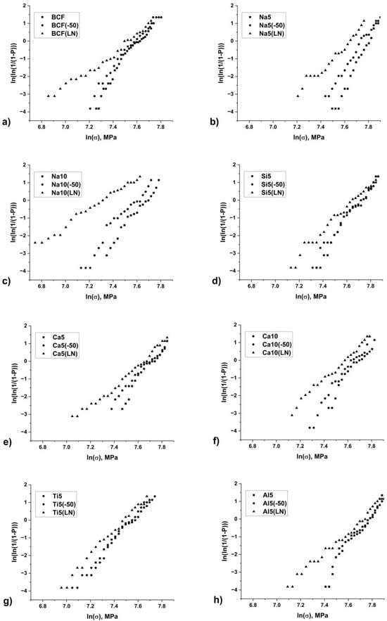 Tensile strength distribution in Weibull diagrams, i.e., the plot of ln(ln(1/1 − P)) vs. ln(Tensile Strength), where P is the probability of failure, for (a) BCF (natural basalt), (b) NA5, (c) Na10, (d) Si5 BCF, (e) Ca5, (f) Ca10, (g) Ti5 BCF, (h) Al5.