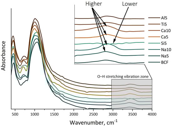 Figure 3 shows the IR spectra of the obtained samples of continuous basalt fibers. The obtained curves have a typical appearance for amorphous basalt systems. The region between 4000 and 3300 cm−1 is considered separately.