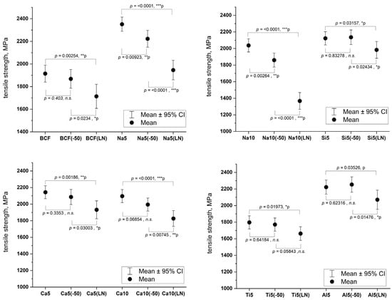As shown in Figure 4, all tested fibers exhibit a statistically significant reduction in strength after liquid nitrogen treatment. The most substantial changes occur in sodium-containing compositions (Na5 and Na10), where p-values reach < 0.0001, fully consistent with their behavior at −50 °C described earlier. This confirms the particular sensitivity of these compositions to low-temperature exposure.