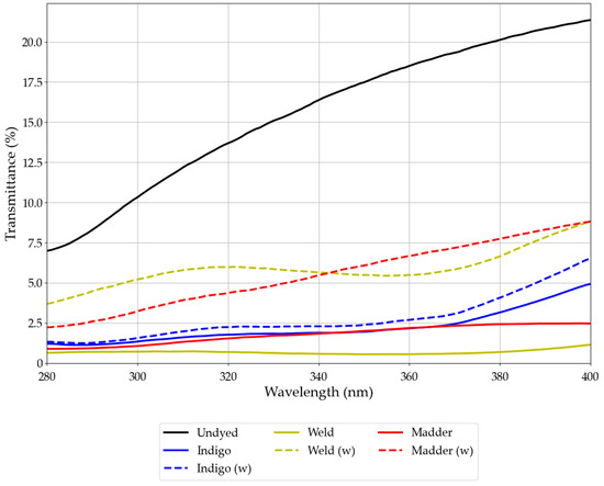 Figure 1 demonstrates the UV transmittance (%) of samples undyed and dyed with indigo, weld, or madder-dyed knit cotton fabrics in the 280–400 nm wavelength range. It highlights their effectiveness in UV protection both before and after washing. These results are consistent with different studies that demonstrated this functionality in natural dyes [35,36,37].