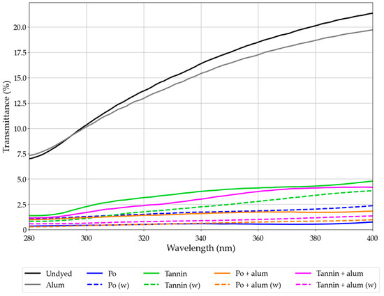 Regarding the mordants used, the fabric mordanted solely with alum exhibited the highest transmittance across the spectrum, indicating minimal UV protection, similar to the undyed control sample. In contrast, all other mordanted samples demonstrated significantly lower transmittance values, confirming that mordanting improves the fabric’s UV-blocking capacity (see Figure 2). Among these, the pomegranate-mordanted sample showed the lowest transmittance percentages, indicating strong UV protection, which aligns with findings in the literature [35]. However, when pomegranate is combined with alum, transmittance levels increased slightly, suggesting a reduction in UV protection compared to pomegranate used on its own.
