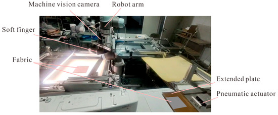 - A signal is sent to the solenoid valve to extend the retractable plate of the drop-off device, allowing the soft gripper to release the first layer of fabric onto the plate surface, as shown in Figure 7a.
