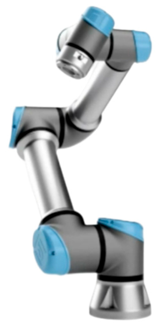 To address this issue, this study employs a new generation of “high-heeled” soft grippers developed by SR Co., Ltd. (Suzhou, China), based on traditional soft gripper technology, as shown in Figure 2b. The design feature of these soft grippers is that one finger is solid and impermeable to air, while the other finger is hollow, as illustrated in Figure 2c. They were installed in a UR5 arm robot (Figure 3).