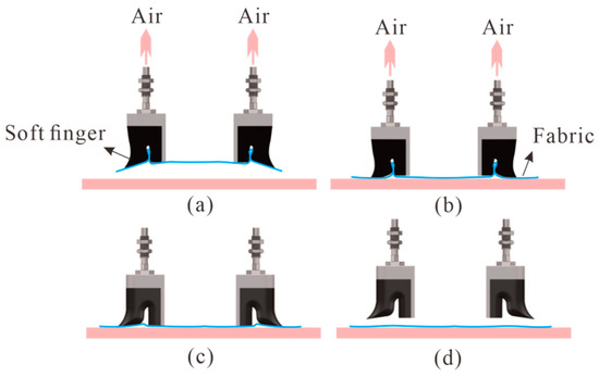 When a positive pressure is applied internally, the hollow finger opens and moves away from the solid finger; conversely, when a negative pressure is applied, the hollow finger closes towards the solid finger. The drop-off process is depicted in Figure 4a–d. The advantage of this soft gripper is that it can press the fabric against the surface of the table before releasing it during the drop-off process, thereby avoiding drop-off deviations caused by free-fall [17].