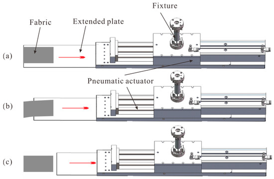 Figure 7. The constructed drop-off device and the drop-off process in conjunction with the soft gripper. (a) Extended plate; (b) mid-retraction; (c) retracted plate. - Another signal is sent to the solenoid valve to retract the plate, laying the fabric onto the underlying surface, as depicted in Figure 7b.