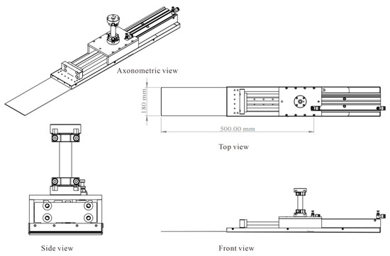 Given the low stiffness of fabrics, which tend to sag when suspended, a drop-off device as illustrated in Figure 5 was designed. This device employs a solenoid valve to control a pneumatic mechanism that actuates the extension and retraction of a metal plate. When the retractable plate is extended, the fabric is placed on its surface. Subsequently, a signal is sent to the solenoid valve to alter the airflow direction in the pneumatic device, causing the plate to retract and lay the fabric onto the underlying table surface. There is a fixture above the drop-off device for the convenience of installing the device onto the profile frame. Figure 6 presents the structural drawing of the device.