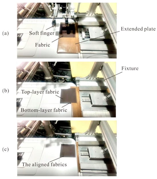 In traditional soft gripper technology, as shown in Figure 2a, soft grippers typically consist of two hollow fingers [21]. When a negative pressure is applied to the soft grippers, the fingers close and grasp the fabric, which is then transported to a designated platform. Subsequently, a positive pressure is applied to the soft grippers to release the fabric. However, since the fabric is a relatively lightweight and flexible material, it is prone to drifting due to air currents and slipping on the platform surface during the free-fall process when the soft grippers release it. This results in misalignment between the successively dropped layers of fabric. Although this method excels in grasping accuracy, it fails to achieve precise alignment, leading to deviations.