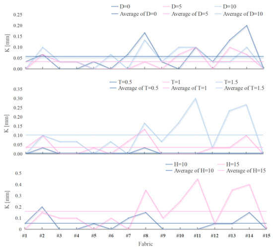 Figure 10 illustrates the variations in drop-off deviation (K) under different parameter settings, specifically examining the influence of fabric placement position (D), retraction time of the retractable plate (T), and installation height of the drop-off device (H) on drop-off performance.