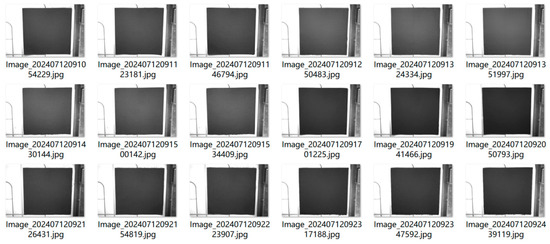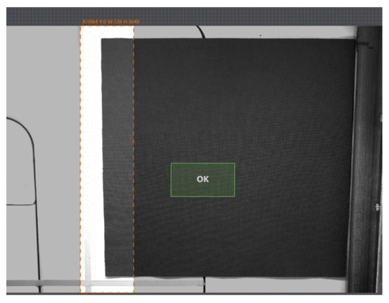 Given the consistently good drop-off performance demonstrated in this study, we introduced a deep learning-based unsupervised image classification technique [33,34]. This method features adaptive learning capabilities and strong robustness, requiring only OK samples to classify all abnormal samples into OK/NG (good/not good) categories, facilitating rapid online classification. An industrial camera (Hikrobot MV-CE200-10GM (Hikvision, Shanghai, China)) was mounted on the robot arm to acquire images immediately after each fabric drop-off, yielding a total of 810 images. These images were subsequently uploaded to the AI-training environment within Vision Master (4.3.0). Representative samples are shown in Figure 11. After the image transfer was completed, the collected images were annotated. Since the cutting quality was excellent, all images were labeled as “OK” (see Figure 12).