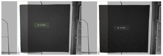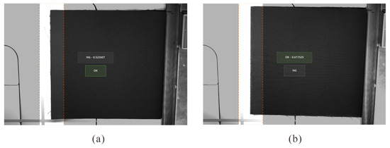 Figure 13 illustrates examples of the prediction results for good (the probability of being classified as “OK” is 97.3489%) and not good (the probability of being classified as “NG” is 51.2536%) drop-off effects. Figure 14 presents two failure cases. In Figure 14a, a sample that was actually OK was misclassified as NG. Detailed inspection revealed loose weft threads along the fabric edge—a kind of fabric absent from the training set—which caused the failure prediction. Figure 14b shows the opposite error: a true NG case mislabeled as OK. Here, the misalignment between the upper and lower fabric edges was so subtle that even human inspectors frequently disagreed, leading the model to miss the defect.