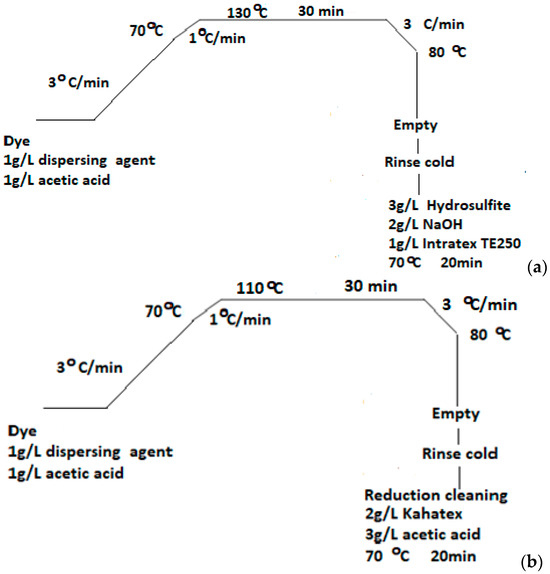Dyeings were carried out in a Rotadyer dyeing apparatus (John Jeffreys Ltd., Rochdale Banbury, UK) set at the appropriate temperatures, equipped with the metal tubes. PΕΤ fabrics and PLA fibres, of m = 2 g each, thoroughly washed with cold deionised H2O and squeezed. These were then dyed at concentration of 2% o.w.f in all cases. The dyebath included final liquor ratio 1:30, with 2 g/L Alcoosperse, 1 g/LCH3COOH and the process line of Figure 3 was followed. The dyebath temperature was raised at 130 °C (in absence of carrier agent) and 110 °C (in presence of carrier agent) for 30 min, regarding PET fabrics. The dyebath temperature was raised at 110 °C (in both absence and presence of carrier agent) for 30 min, regarding PLA fibres. The time of 30 min was considered more than sufficient for dyeing and the system equilibrium to be achieved. The rinse, cooling and final fixing are described in Figure 3 for each case. Dyed PLA fabric was immersed in a cleansing bath at 70 °C, containing 2 g/L Kahatex, 3 g/L CH3COOH, for 20 min. For PET fabrics, the treatment involved immersion in a dyebath containing 3 g/L Na2S2O4, 2 g/L NaOH, 1 g/L Intratex TE 250 at 70 °C, for 20 min too. The finishing treatments after dyeing are important for “securing” the dye molecules onto the fibres and then evaluating their performance by fastness tests. Samples dyed were allowed to dry, then eventually used for the fastness tests, exhaustion calculations, colour measurements and visual estimations.