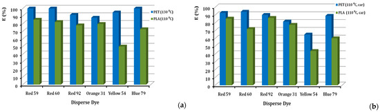 Percentages of dye exhaustion (%E) for each of the six dyes, when applied to PLA and PET, are given in Figure 4. The value of the exhaustion of the dyebath is an important parameter, both as a sign of colour resilience and at the same time, as a direct relation to the cost of the dyeing process and the control of its sewage [25]. The exhaustion of all disperse dyestuffs is higher on polyester that is dyed at 130 °C, when compared to the exhaustion of the same dye on PLA at 110 °C, in the absence of a carrier agent (Figure 4a). This can be attributed to the more accessible polyester structure at the higher temperature, allowing the absorption and diffusion of more dye molecules in the polymeric substrate of polyester. The temperature of 130 °C cannot be applied to PLA, due to the low durability of the macromolecules at that temperature. In addition, exhaustion values for each of the six dyes, when applied to PLA and PET at a dyeing temperature of 110 °C with a carrier agent, are given in Figure 4b. The same pattern is observed in dyeing at 110 °C (in the presence of a carrier for both PET and PLA), as can be seen in Figure 4b, where all disperse dyes exhaust more on polyester rather than the PLA fibres. Meanwhile, all classes of disperse dyes seem to become exhausted on both substrates to acceptable levels; the only exception is the D. Yellow 54, which shows the lowest exhaustion rate on PLA. This can possibly be attributed to the lower molecular size of its quinoline type, MW = 289. E(%) values range widely, being as low as 50% for D. Yellow 54 and as high as 85% for D. Red 59. The rest of the dyes have exhaustion values above 70% at 2% o.w.f. According to the literature, the D. Yellow 54 has a low %sorption [26], which explains the low %E of this colour. In Figure 4b, almost all the dyes, except D. Yellow 54 (43.9%), have exhaustion values above 50%. In this case, for the D. Red 92, the %E is higher for PET than PLA, and generally higher than that of PLA (110 °C) without a carrier. On the other hand, the D. Blue 79 has a lower %E (50.2%) on PET than PLA (110 °C) without a carrier (72.8%), and similarly, the D. Red 60 showed %E (52.1%) lower than PLA (at 110 °C) without a carrier (82.2%). Generally, it is shown that the dye-uptake value of the PET fabric is higher than the PLA fibre, due to its high dyeing temperature [27]. In a more thorough investigation, considering the detailed chemical structures of the commercial dyes, it is perhaps necessary to understand the dye affinity to PLA. Lunt & Bone stated that medium-energy dyes were the most suitable ones for PLA [15,28]. Linear dyes were found to give good exhaustion rates on high crystallinity spun-bonded PLA [4].