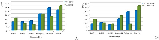 Colour yield is a term used to describe colour efficiency and strength. The colour yield for each of the six dyes, when applied to PLA and PET, are given in Figure 5a,b, either at 130 and 110 °C or in the presence and absence of a carrier agent. As shown in Figure 5a, the colour yield on PLA is higher than on PET in both cases, although disperse dye exhaustion on PLA is lower than that on PET [25], which was attributed to the lower temperature applied. The explanation was the higher reflectance of PLA [4,14,25]. The final rinse and setting in polyester dyeing are of great importance (Figure 3), in order to immerse the final shade; after this, the disperse dyestuff that is not retained goes away. Moreover, the way to maintain the colour achieved, over time, demands the appropriate surfactant chemistry. PET polyester usually is finalized with alkali reduction, but for other synthetic fibres, like polyamide, Lycra®, polyacrylic and acetates, alkali reduction is too harsh, so acidic reduction cleansing is preferred (Figure 3). We chose this type for PLA too, as a more sensitive fibre compared to PET. “Redusante” agent is applied for this reason, along with the other non-ionic wetting agents described in Figure 3. Regarding the differences in the physical form of the PLA fibres and PET fabric, we consider that this slightly affects the colour result, because the equilibrium conditions were achieved upon dyeing. This means that we are certain the best colour yield possible was achieved in each case.