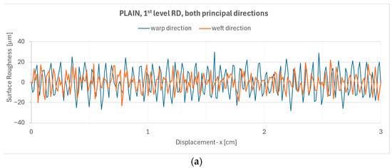 Based on Figure 1a, which represents the measured surface roughness of plain fabrics at the I level of relative fabric density, the warp direction (blue line) showed a higher amplitude in surface roughness than the weft direction (orange line). Higher amplitude in the warp direction indicated greater vertical deviations in the surface profile—the peaks and valleys were more pronounced. As the sensor moved along the warp direction (i.e., across the weft threads), it captured height differences between adjacent weft yarns. Due to the lower weft density (fewer picks per unit length), the spacing between weft yarns was greater, resulting in a coarser surface profile. This led to higher surface roughness in the warp direction. In contrast, the surface profile in the weft direction was smoother and more uniform. Here, the sensor moved across the warp threads, which were typically present in higher density. The increased frequency of thread intersections led to a finer micro-topography, with lower amplitude deviations. The tightly packed warp threads contributed to a more stable and even surface, minimising undulations. Additionally, the tension and overlapping of warp yarns helped flatten the surface, further reducing surface irregularities. Figure 1a also shows the difference in frequency of the peaks in the warp and weft directions. Due to the higher number of warp threads per unit length, the weft direction had a higher frequency of peaks and valleys. The warp direction showed lower frequency variations, consistent with fewer weft threads.