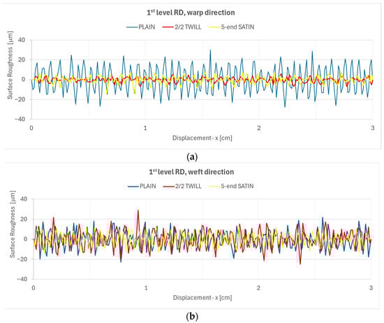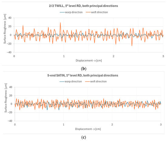 Surface roughness of woven samples at the first level of relative fabric density in both principal directions for (a) plain, (b) 2/2 twill, and (c) 5-end satin fabrics.