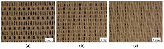 Photographs of tested woven samples at the first level of relative fabric density at 20× magnification for (a) plain, (b) 2/2 twill, and (c) 5-end satin fabric.