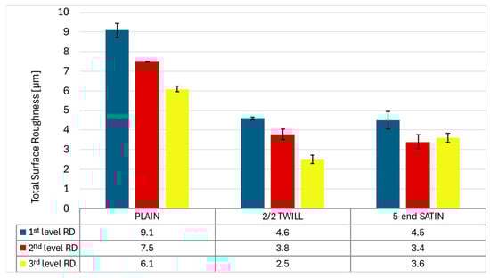 - Plain fabrics exhibited the highest surface roughness due to frequent warp-weft interlacements and pronounced crimp height. 2/2 twill fabrics exhibited intermediate surface roughness, where diagonal floats mitigated the influence of structural density. In contrast, 5-end satin fabrics yielded the lowest overall surface roughness, attributable to extended longitudinal floats and minimal interlacement points, which produced the smoothest and flattest surface profile at the first and second levels of relative fabric density. At the third level of relative density (highest compression), the 2/2 twill fabrics exhibited significantly lower surface roughness (2.5 µm), which is a reversal of the performance hierarchy observed at lower densities;