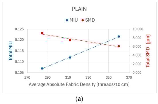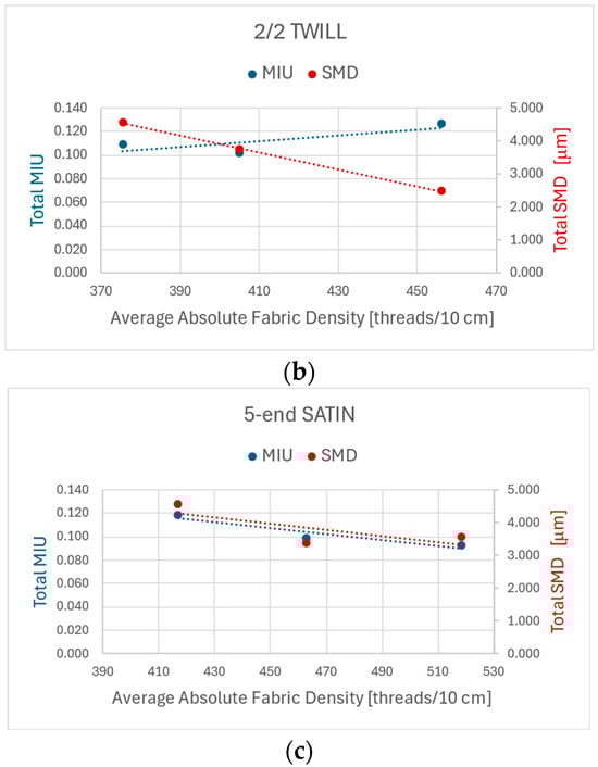 Since surface roughness is a basic material characteristic that affects friction, we included an analogy between the two in the study. Figure 5 shows the relationship between total surface roughness (SMD), the coefficient of friction (MIU), and absolute thread density in the fabric. The absolute thread density was calculated as the arithmetic mean of the warp and weft thread densities.