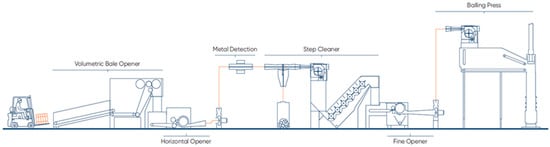 Pretreatment of textile waste plays a crucial role in the recycling of textiles. The pretreatment stage in the mechanical recycling of textiles primarily involves the opening and cleaning of textile waste. This process involves both manual and automated removal of unwanted materials, followed by sanitation processes [22]. This waste typically arrives in the form of bales, bulk material, or large sacks, and may be wrapped in plastic or bound with metallic or synthetic strings. As illustrated in Figure 4, industrial setups for cotton waste processing include a series of openers, metal detection systems, step cleaners, and baling presses [23].