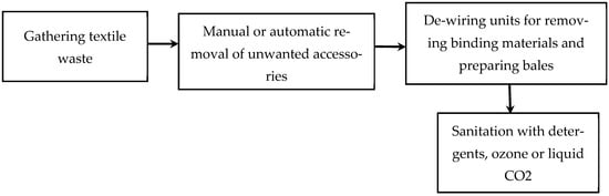 To handle the textile materials efficiently, these systems incorporate conveyors, metal removal units, and de-wiring stations. Metal removal is essential to protect downstream equipment by effectively separating metallic contaminants. De-wiring units facilitate the removal of binding materials, thereby streamlining the preparation of bales for subsequent processing stages [29]. The sanitation step aims to eliminate contaminants such as sweat and sand through industrial cleaning methods using detergents, ozone, or liquid carbon dioxide [22]. The general process diagram of pretreatment in the mechanical recycling of textiles is presented in Figure 5.