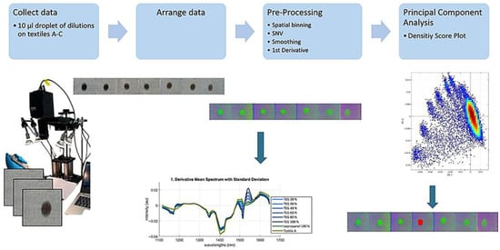 Workflow for hyperspectral data collection and analysis. Hyperspectral images were captured immediately (within 13 s) of applying 10 µL droplets onto textiles A, B, and C. Data were arranged according to concentration levels using the HYPER-Tools3 Matlab tool. Preprocessing steps included spatial binning, SNV transformation, smoothing, and first derivative calculation. Spectra are then collected from the ROI and the uncontaminated textile areas. PCA was then performed, and results were visualized as score–density plots.