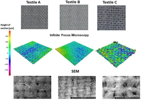 Imaging measurements were conducted using a focus-variation light microscope, specifically the Infinite Focus G4 (Alicona, Graz, Austria), in conjunction with the IFM 3.5.1.5 x 64 software. This methodology, known for its precision, involved constructing detailed 3-D surface models from a series of captured images, allowing for the precise calculation of x, y, and z co-ordinates within the scan’s defined resolution. For this comprehensive study, three textile samples (A, B, and C) were thoroughly analyzed utilizing a 5× objective lens. This approach provided a vertical resolution of 4 µm and a lateral resolution of 8 µm, facilitating the development of an accurate 3-D model. In addition, high precision 2-D optical micrographs were taken with the same parameter set.