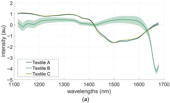 The mean spectra of the uncontaminated textiles (Figure 4a) underline these effects: Textiles A and B displayed nearly identical absorbance profiles with low variability. Textile C showed higher spectral variability, with a larger standard deviation and increased absorbance, particularly beyond 1600 nm. This can be attributed to both its coarse fibre structure and material composition (polyester), which differ from the cotton-based blends used in Textiles A and B.