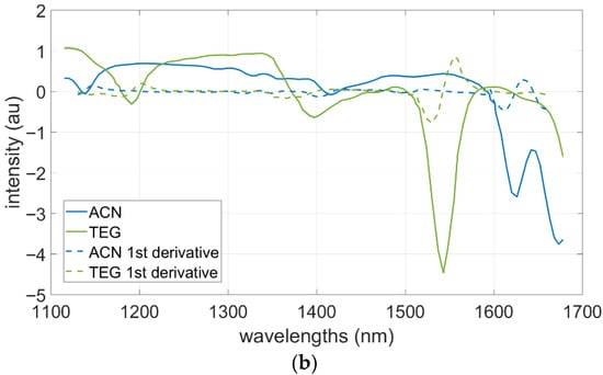 The processed spectral data after SNV, smoothing, and first derivative are shown in Figure 5. For ACN, the most pronounced changes occur between 1570 and 1650 nm in Textiles A and B and between 1570 and 1610 nm in Textile C. Similarly, the spectral response to TEG shows absorption features across the textiles, with characteristic spectral bands in the 1470 to 1570 nm range. For Textiles A and B, these informative bands fall within their general region of maximum absorbance (1400–1650 nm). Although the baseline absorbance of these two fabrics is lower than that of Textile C (see Figure 4a), the TEG-specific features remain clearly distinguishable across all textiles.