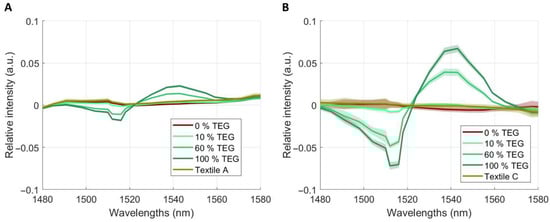 Mean spectra with standard deviations resulting from HSI after SNV transformation, smoothing and first derivative for TEG on Textile A (panel A) and Textile C (panel B). Four concentration levels are shown (0% = 100% isopropanol, 10%, 60%, 100% TEG), focusing on the relevant region of interest.