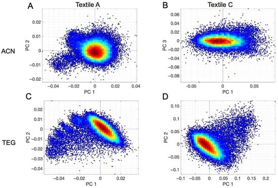 For ACN, Textiles A and B display distinct and well-defined clustering in PC1 and PC2 space. In contrast, Textile C exhibits a less pronounced clustering pattern with separation in PC1 and PC3For TEG (Figure 8C,D and Figure 10), more consistent clustering patterns were observed, with contaminated textiles exhibiting concentration-dependent clustering patterns based on their absorption behaviour.