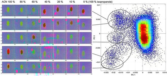 Density score plot of PC1 and PC2 from PCA of acrylonitrile on textile B, with corresponding cluster regions highlighted in red in false-coloured hyperspectral images. The ACN dilution series ranges from 100% ACN to 0% ACN (=100% isopropanol), with isopropanol as the diluting agent.