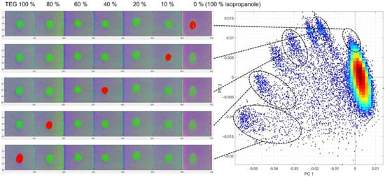 Figure 10 presents the false-coloured HSI results for TEG interaction with Textile B, revealing a particularly strong and well-defined dilution-dependent clustering effect. Compared with ACN, TEG produced clearer separation across all concentration levels.