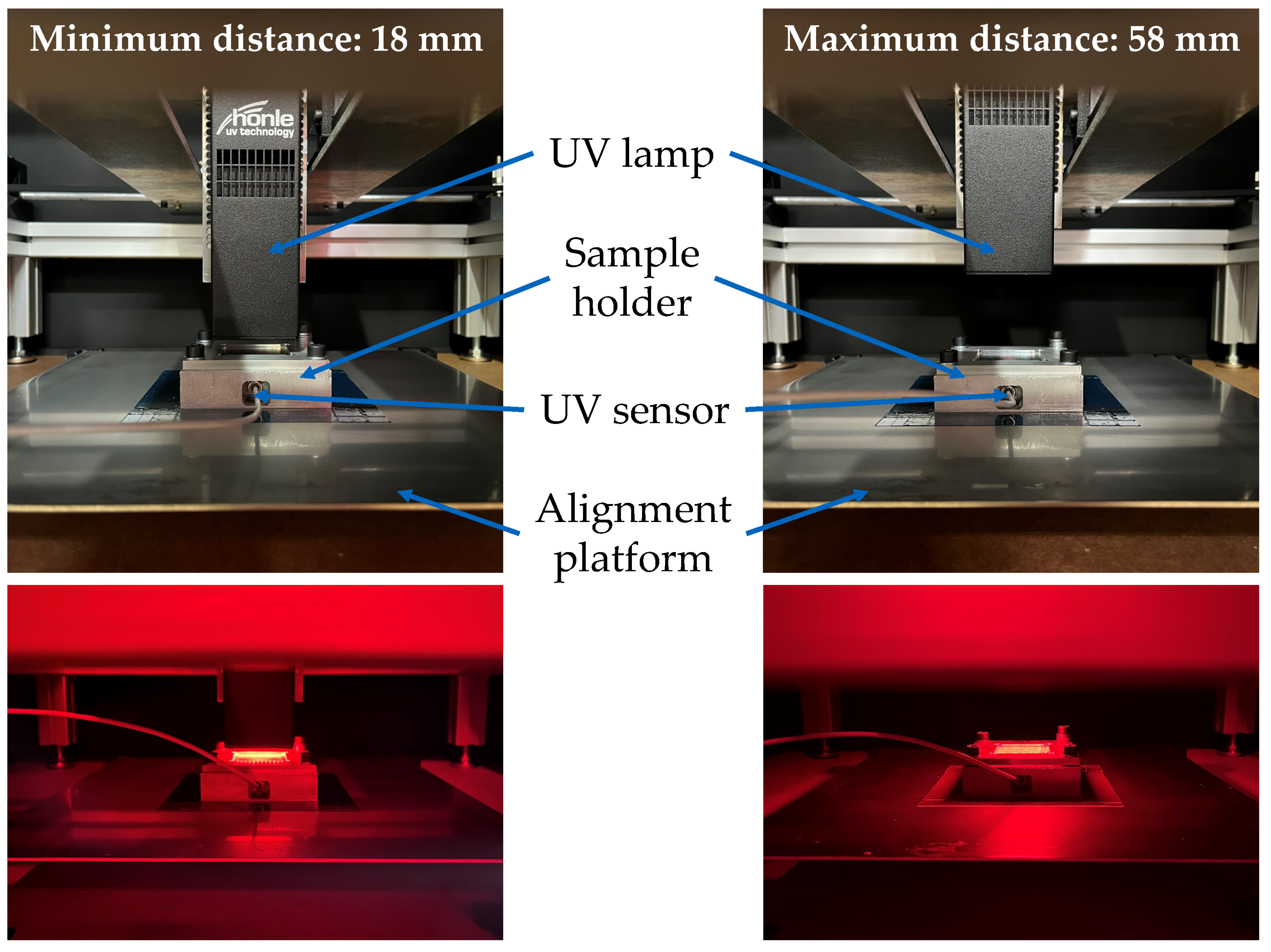22]. The experiments conducted by Endruweit et al. had a simple and reproducible setup: the samples, placed between two glass panes and an aluminum spacer, were positioned between the UV lamp, which irradiated the sample, and a UV sensor, which measured the amount of light transmitted through the sample [