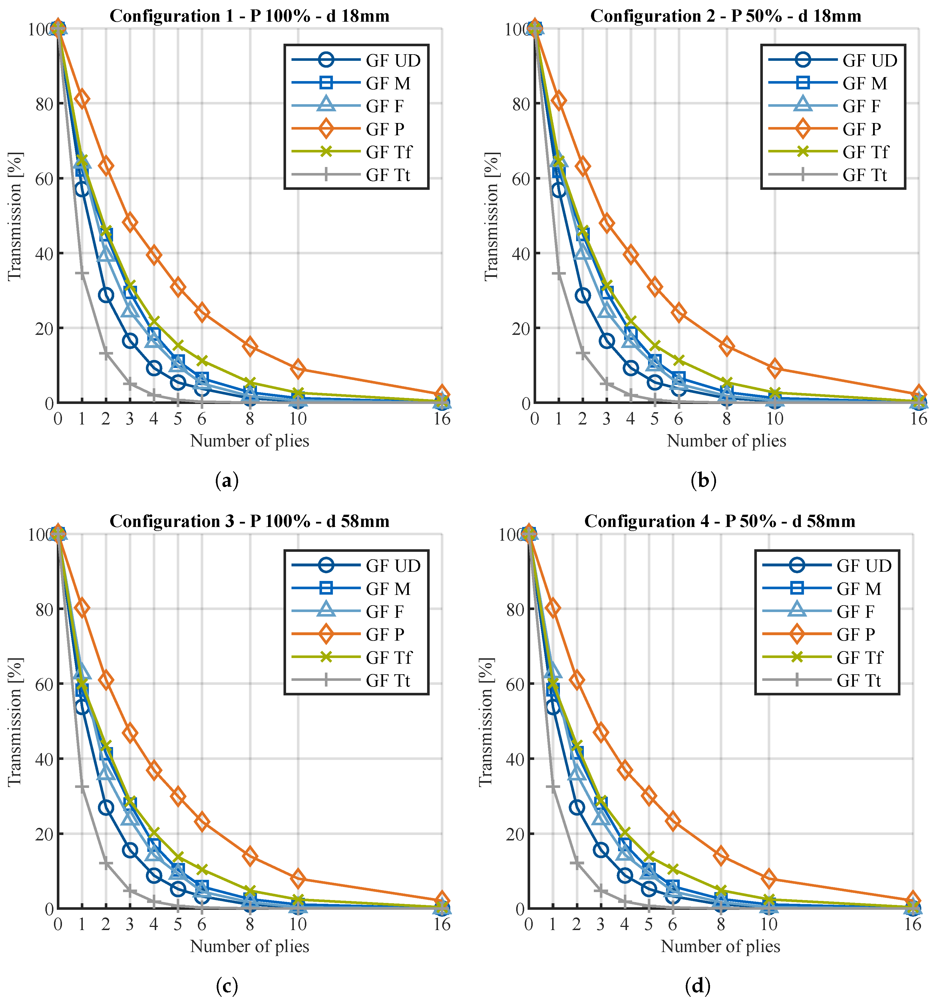 Table 1). However, the ply structure of GF UD is inherently tighter than that of GF M and GF F, resulting in GF UD being less transmissive. These principles also explain the difference between the materials in the rate of transmission decrease with increasing ply count. For example, the thinner and looser GF P requires multiple plies before it reaches an overall laminate tightness and thickness comparable to that of GF Tt.