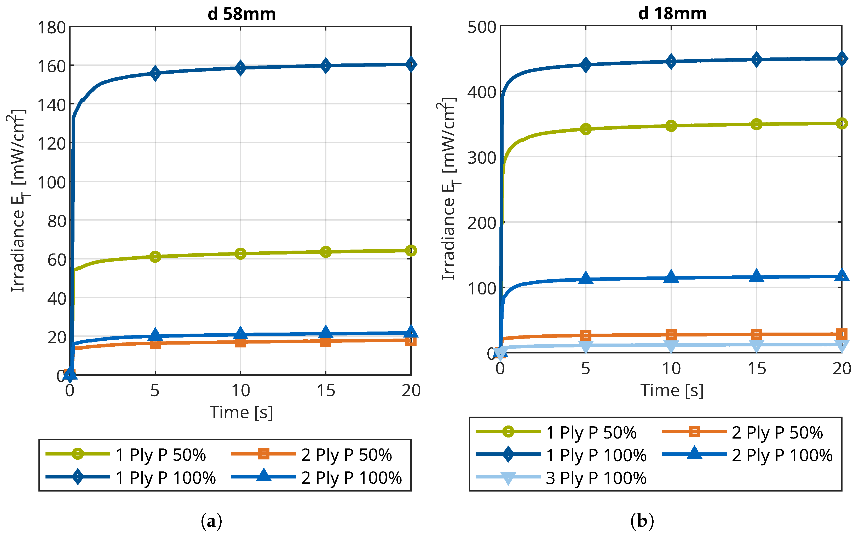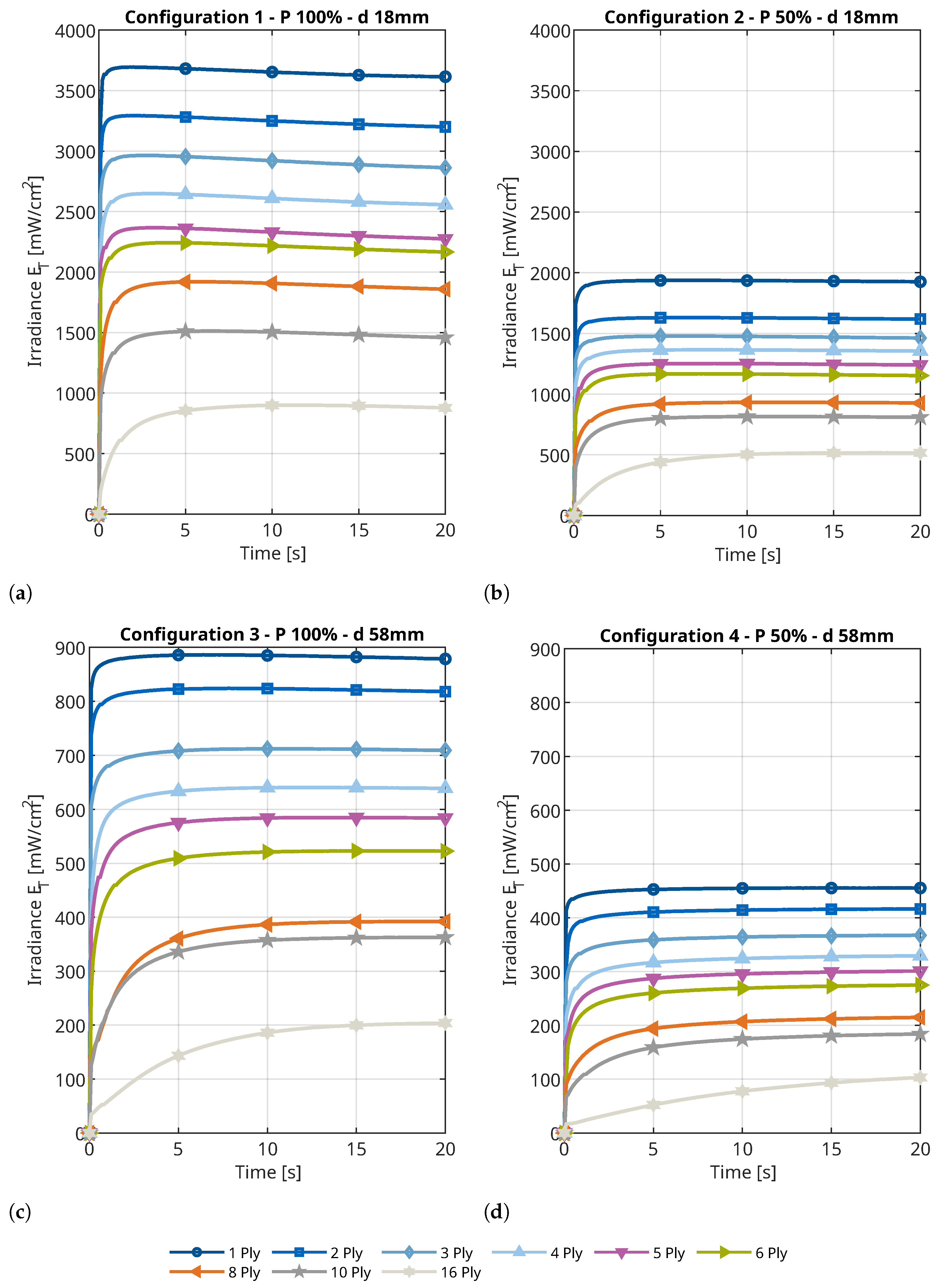 Figure 5 displays the transmitted irradiance over the irradiation time of 20 s and compares the experimental results of the impregnated GF UD across all four configurations. This paper does not show the results of the other impregnated materials, since the overall findings gathered from the comparison of the results of the four configurations are consistent across all materials.