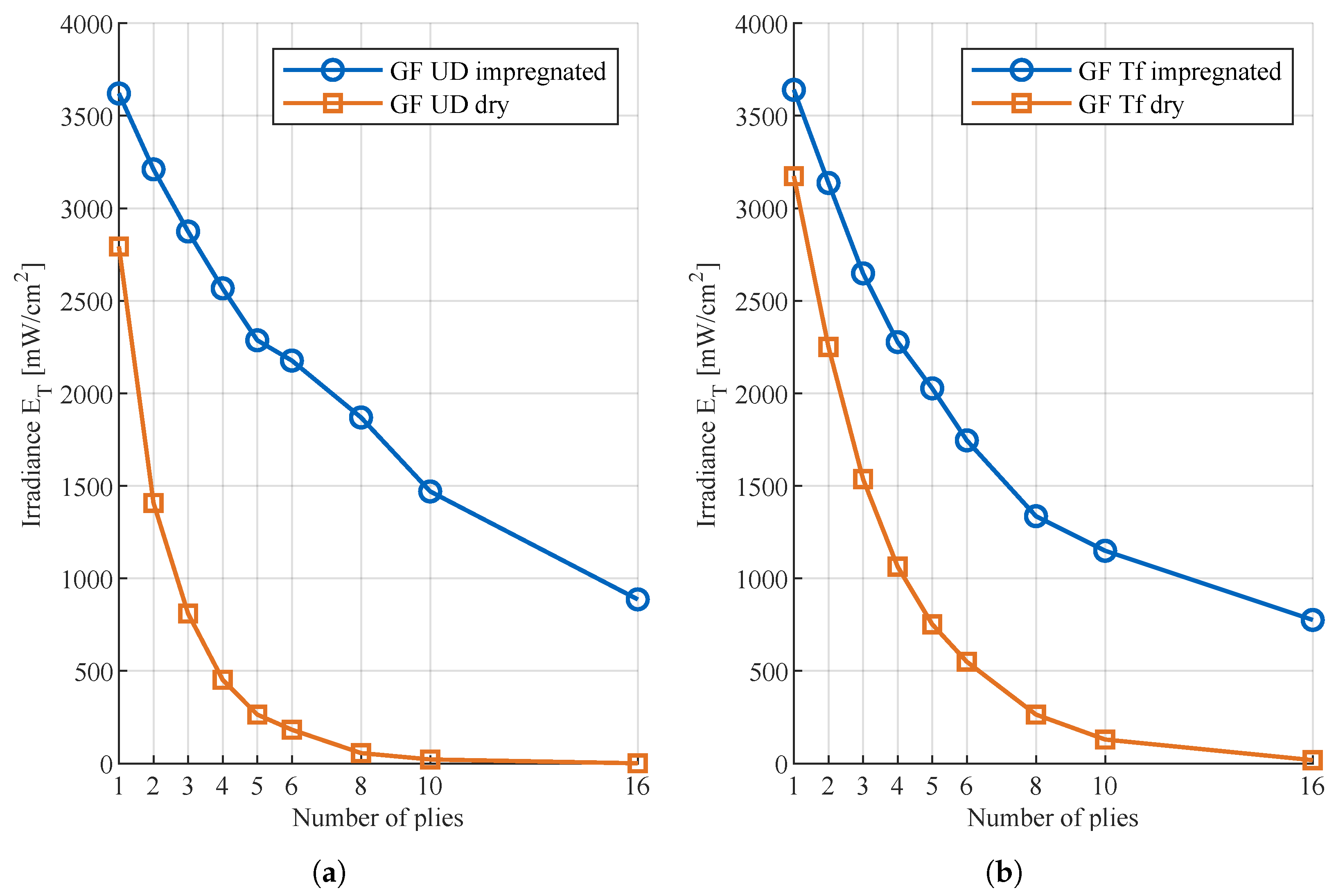 54]. In the case of the impregnated materials, however, the refractive index of the matrix and that of the fiber material are similar, thus reducing the RSL in impregnated fibers. Therefore, with increasing plies, the irradiance decreases faster in dry samples. In impregnated samples, the RSL is smaller since the overall laminate is more uniform, and therefore, the decrease is caused primarily by the increasing thickness.