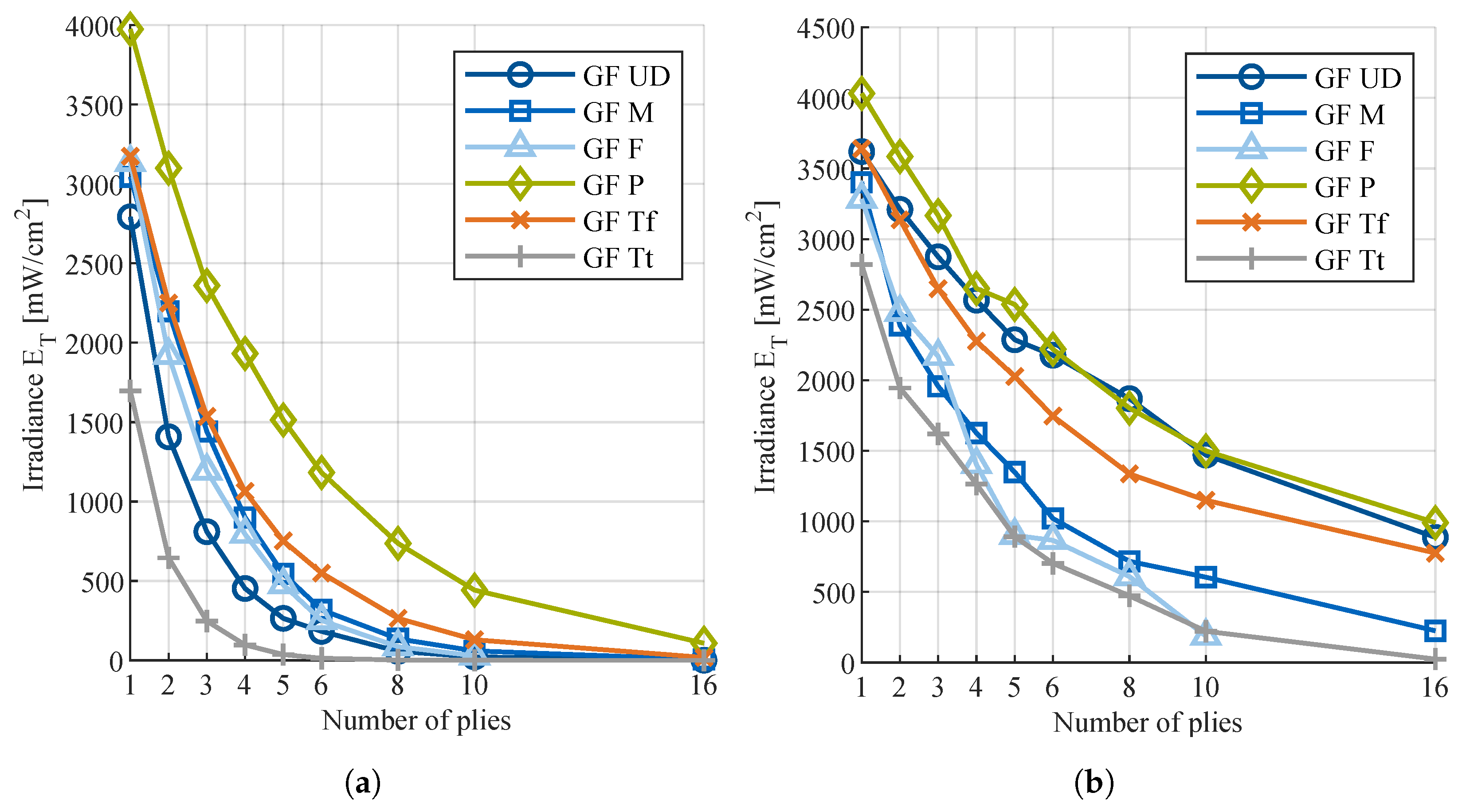 22]. Furthermore, 16 plies of GF UD in configuration 1 still let an irradiance above 880
