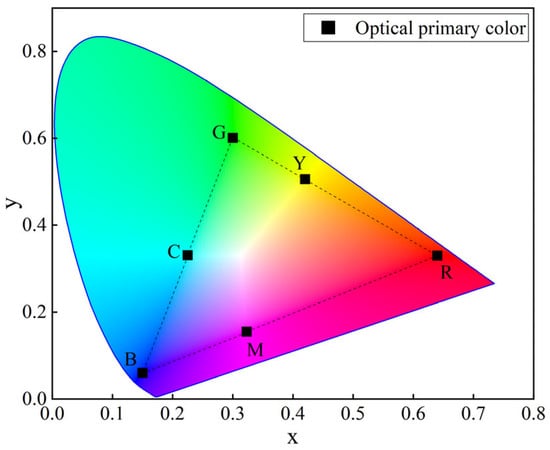 This process yielded a full-color-gamut weight matrix (Equation (8)), a corresponding mixing ratio matrix (Equation (9)), and a final color value matrix (Equation (10)), as follows: